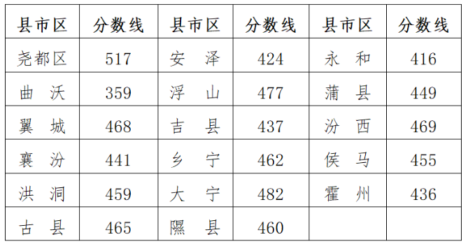 3.浮山中学、乡宁一中指标到校生源范围为本县,录取具有指标到校资格的考生,最低分数线控制在2所高中学校县域招生各自最低录取控制线下60分以内。