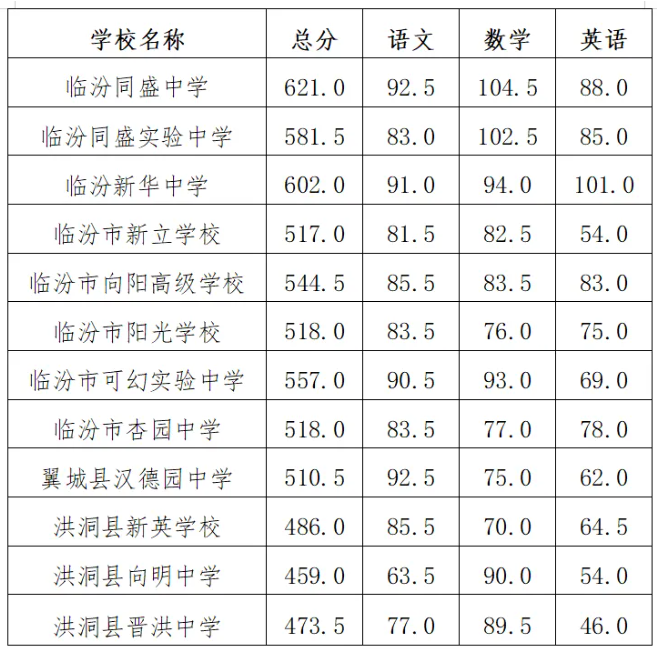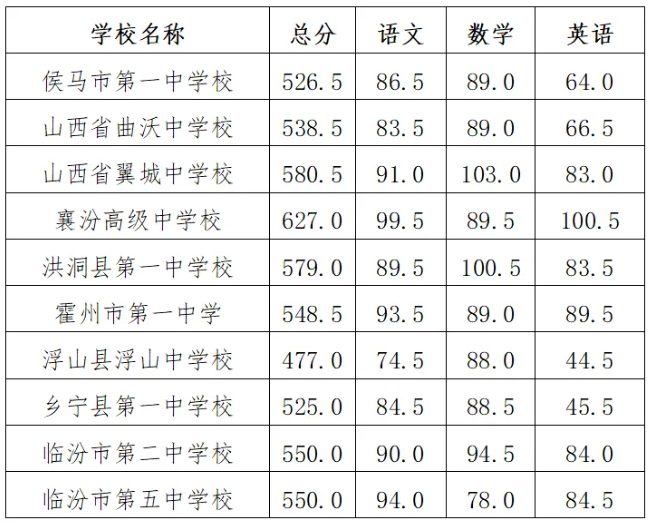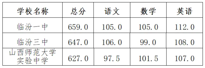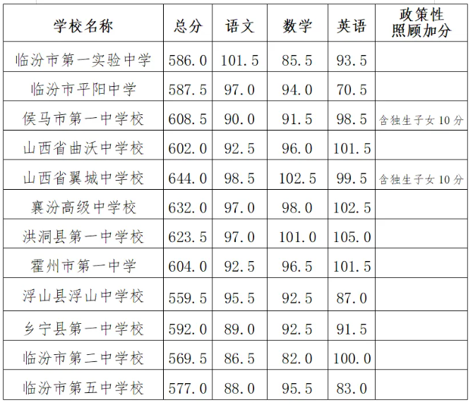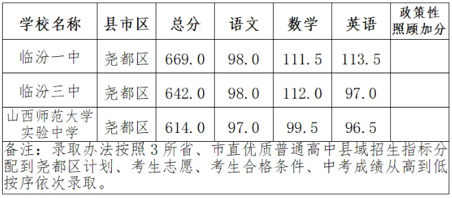 (一)省、市直学校临汾一中、临汾三中、山西师范大学实验中学、临汾市第一实验中学、临汾市平阳中学校执行尧都区最低录取控制分数线。