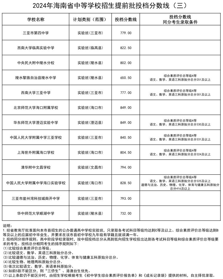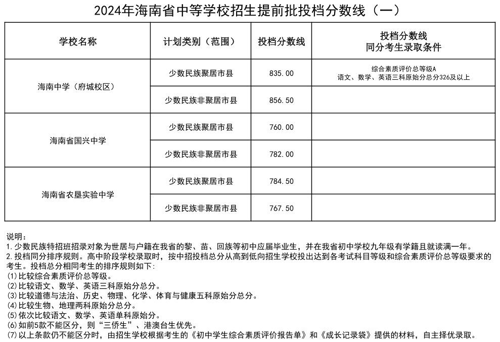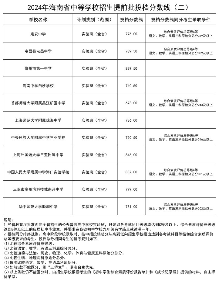 海南省考试局 2024年海南中等学校招生提前批投档分数线(一/二/三/四)